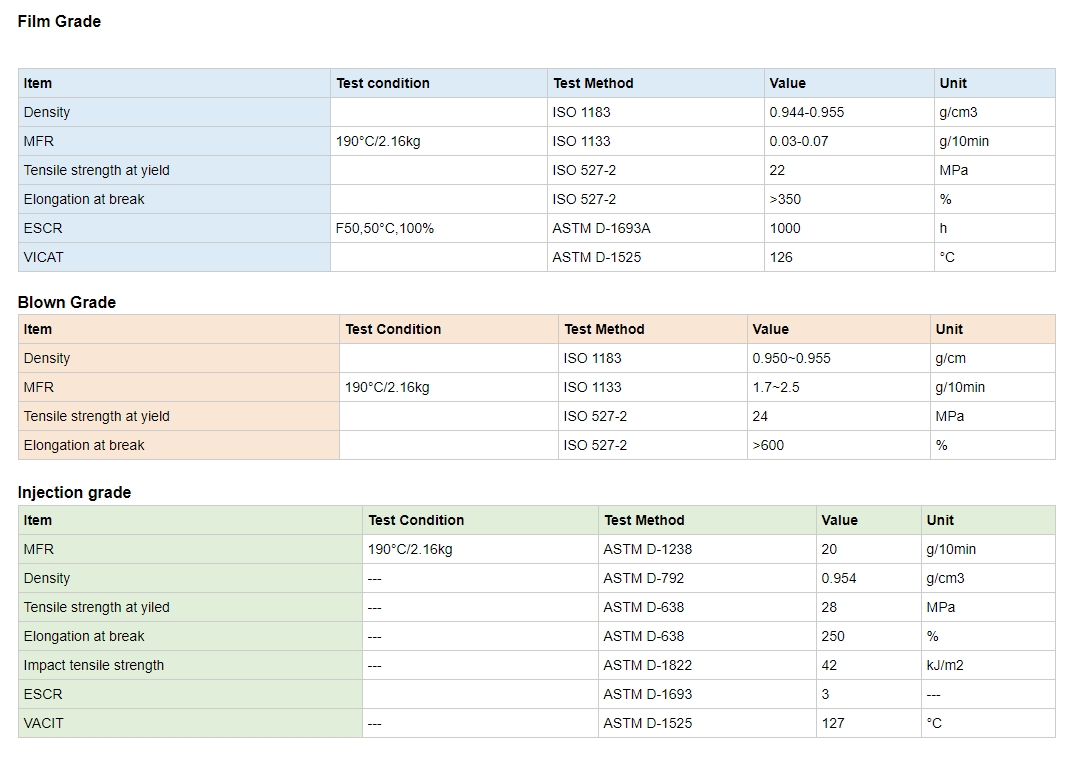 High density Polyethylene (HDPE): is a highly crystalline non-polar thermoplastic resin produced through the copolymerization of ethylene and a small amount of ¦Á-olefin monomer. HDPE is synthesized under low pressure and is therefore also called low-pressure polyethylene. HDPE is mainly a linear molecular structure and has little branching. It has a high degree of crystallization and high density. It can withstand high temperatures and has good rigidity and mechanical strength and anti-chemical corrosion.