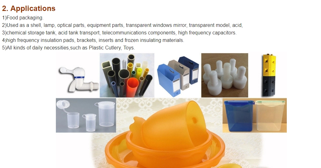 1)Light quality, low price, low water absorption, good coloring, dimensional stability, good electrical properties, transparent products.